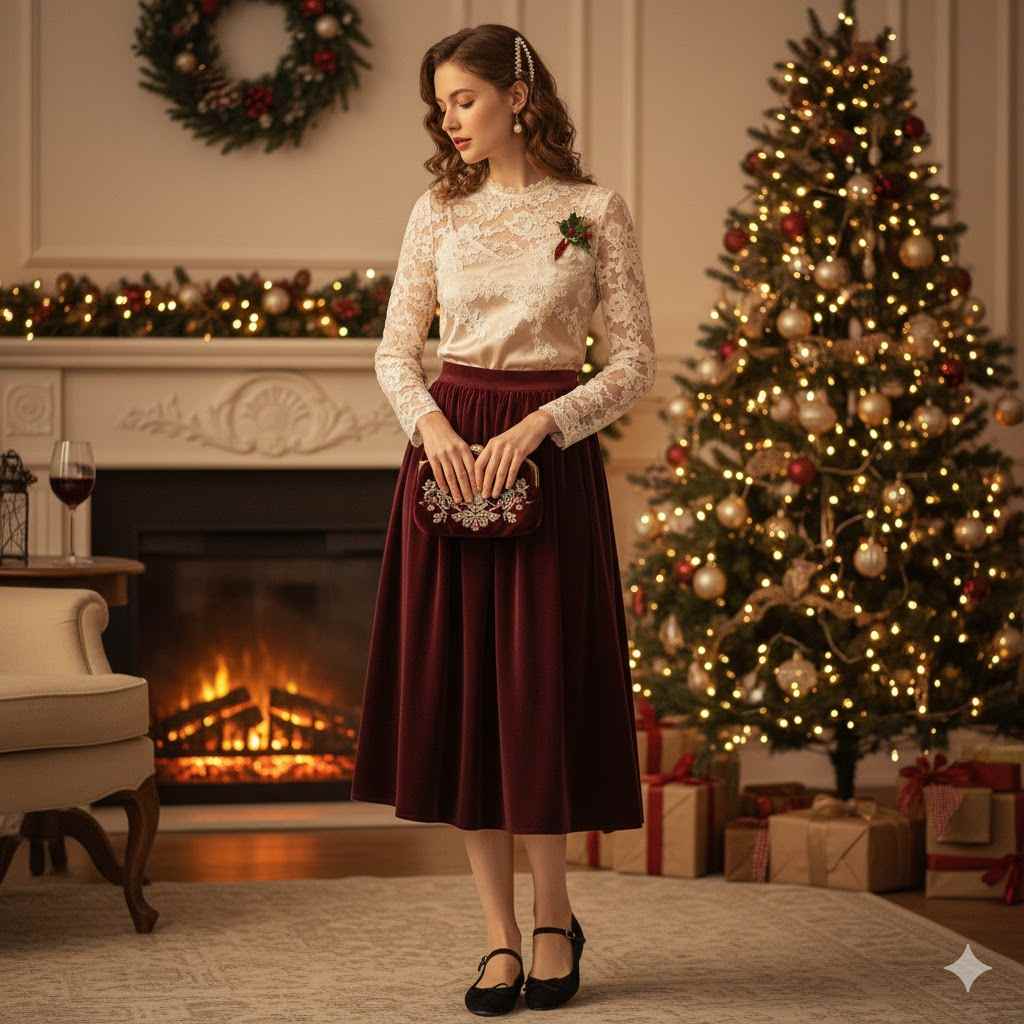 11. Lace Top and Velvet Skirt for Romantic Christmas Eve Outfits