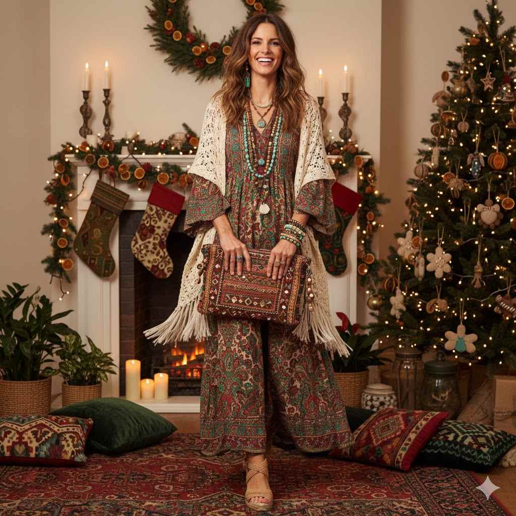 13. Bohemian Maxi Dress with Festive Accessories for Free-Spirited Christmas Eve Outfits