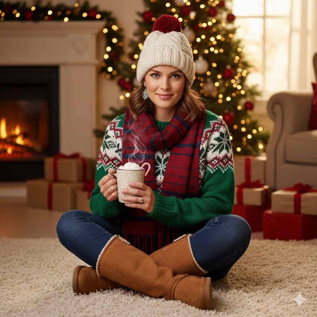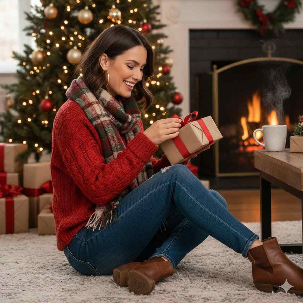 Add ankle boots and a plaid scarf for extra warmth and a pop of pattern. This look screams holiday cheer without trying too hard, making it ideal for Christmas morning gift openings.