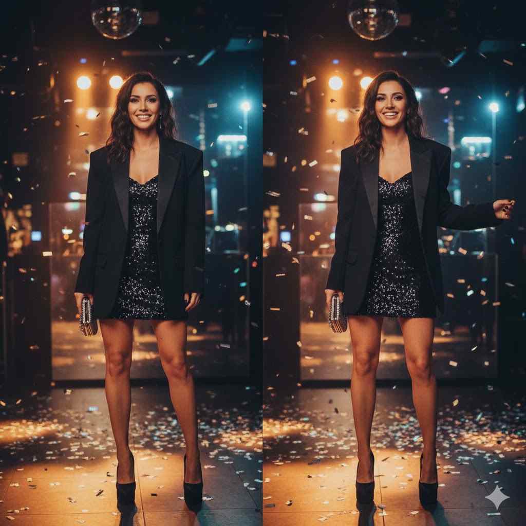 Platform heels elevate it for height and confidence. This duo rocks dance floors at lively parties. Remove the blazer for more sparkle later in the evening. Choose a structured blazer for sharp lines.