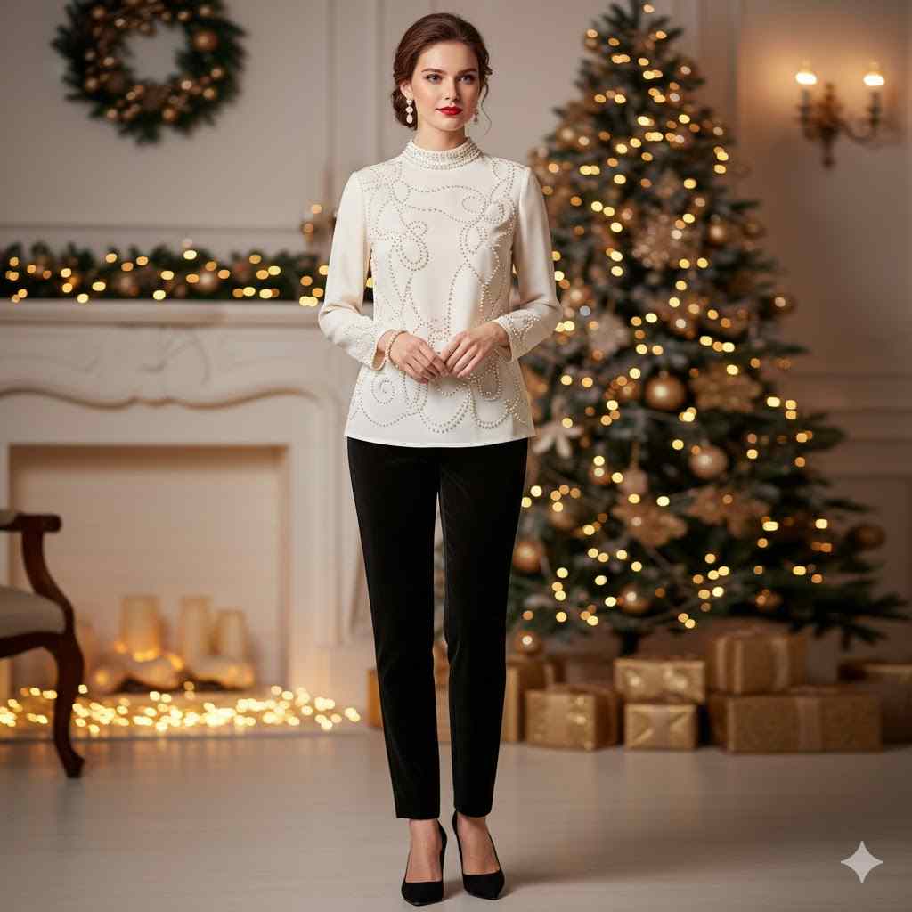 Select a shimmering sequin top tucked into wide-leg trousers for balanced proportions. The sequins provide just enough sparkle for festivities without overpowering.