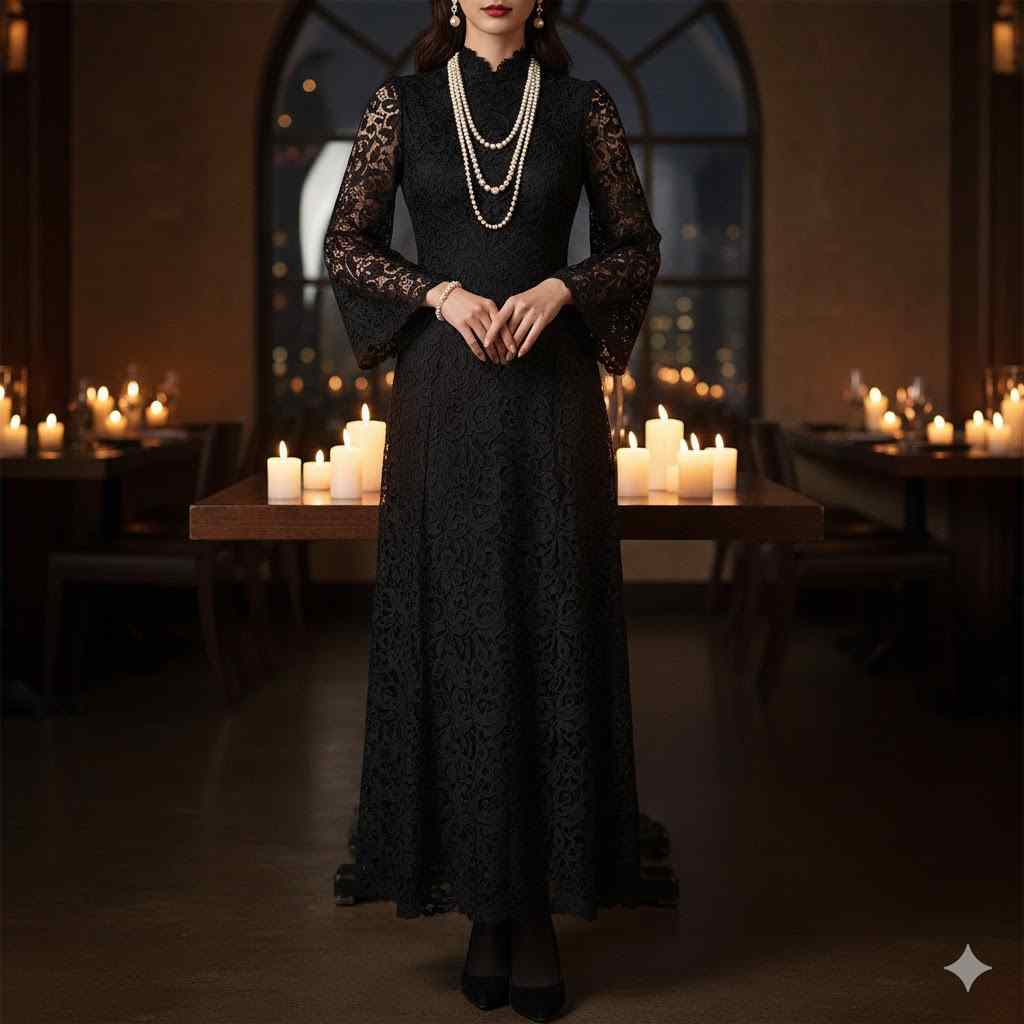 A black lace dress with long sleeves offers mystery and coverage. The intricate lace details provide visual interest.