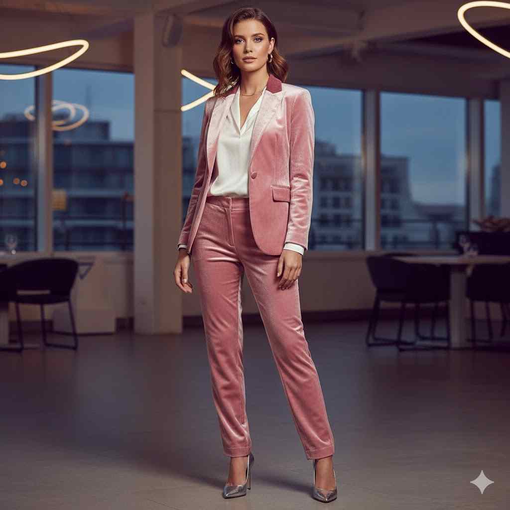 A soft pink velvet suit breaks tradition with its unexpected color. The velvet’s smoothness feels luxurious. White blouse inside for contrast.