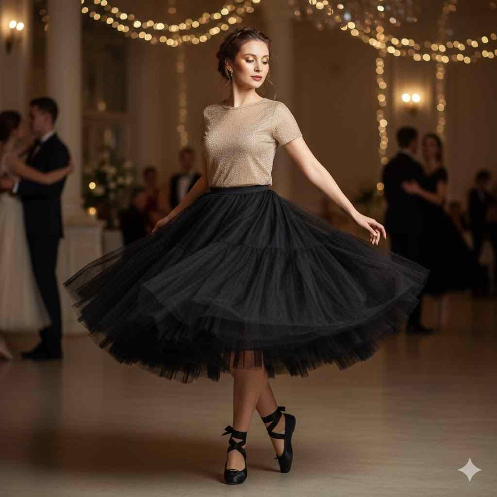 A glitter top with a black tulle skirt twirls nicely for movement. The glitter provides subtle shine, while tulle adds volume. Ballet flats for a fairy-tale vibe.