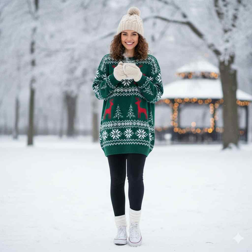 Opt for an oversized sweater featuring cute Christmas motifs like trees or reindeer for a playful touch.