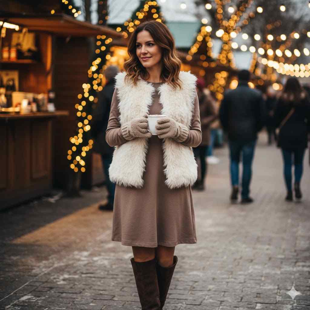 Layer a faux fur vest on a simple shift dress in neutral tones like beige or gray. The fur adds a luxurious texture that elevates the basic dress without overwhelming it.