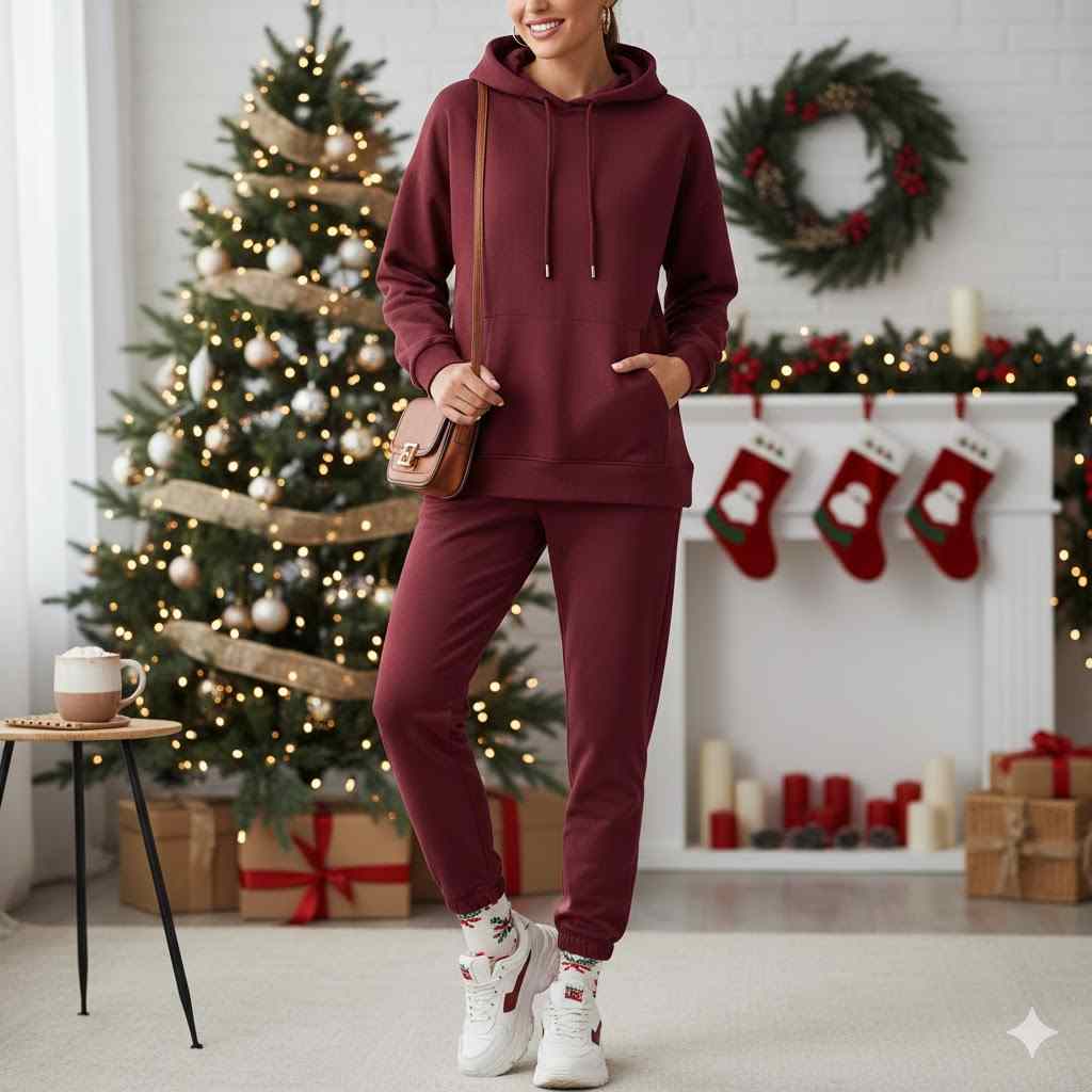 Go for a burgundy hoodie paired with matching joggers for a coordinated, athleisure-inspired look.