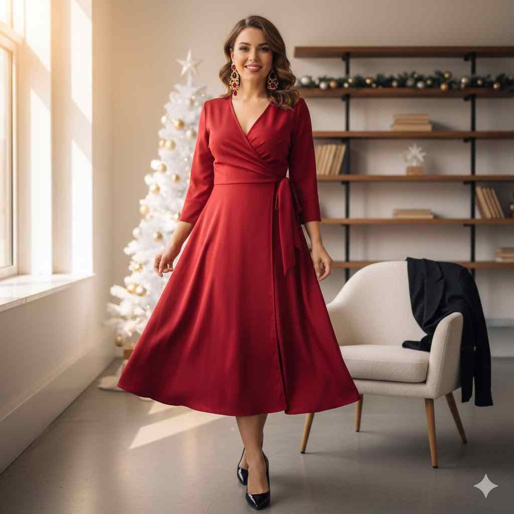It’s a timeless choice among Christmas outfits female, and you can layer with a blazer for more formality.
