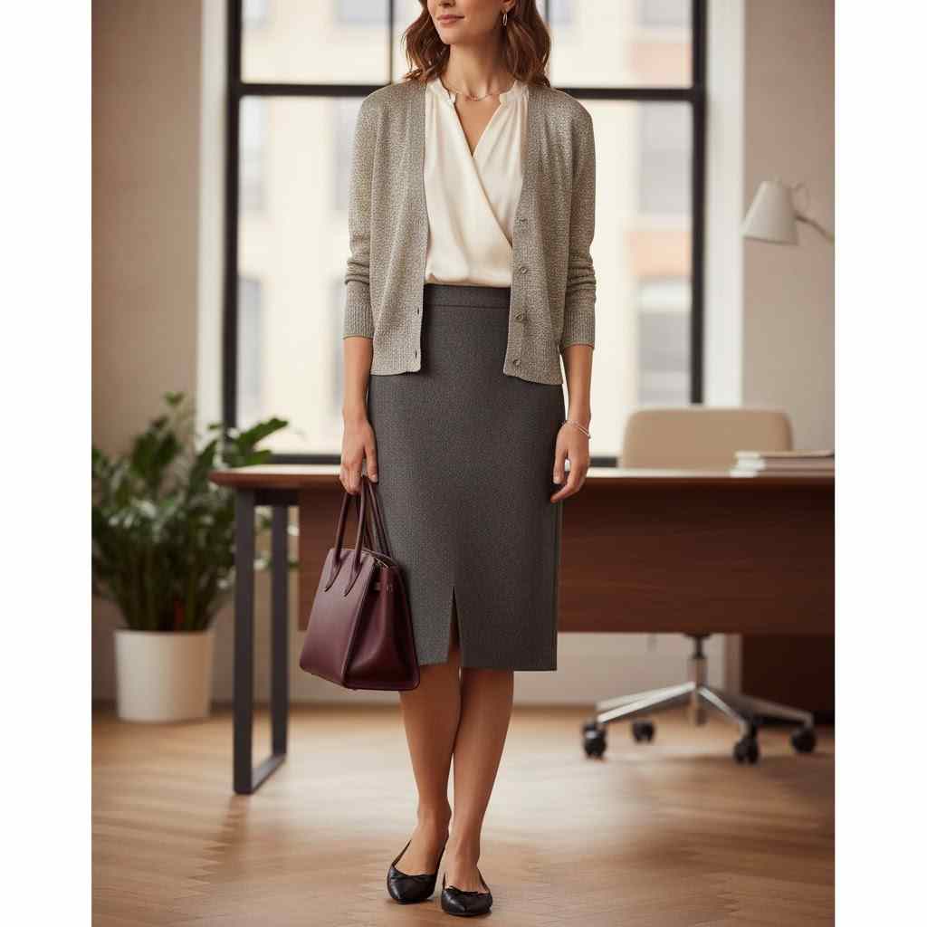 The subtle shine feels holiday-appropriate without excess, ideal for conservative workplaces. Button the cardigan halfway for a relaxed feel.