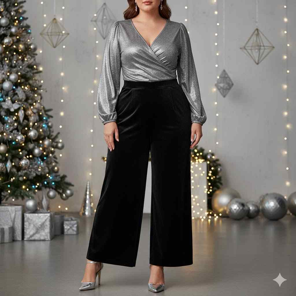 Wrap top in silver over wide-leg pants. Modern Christmas party outfit plus size.