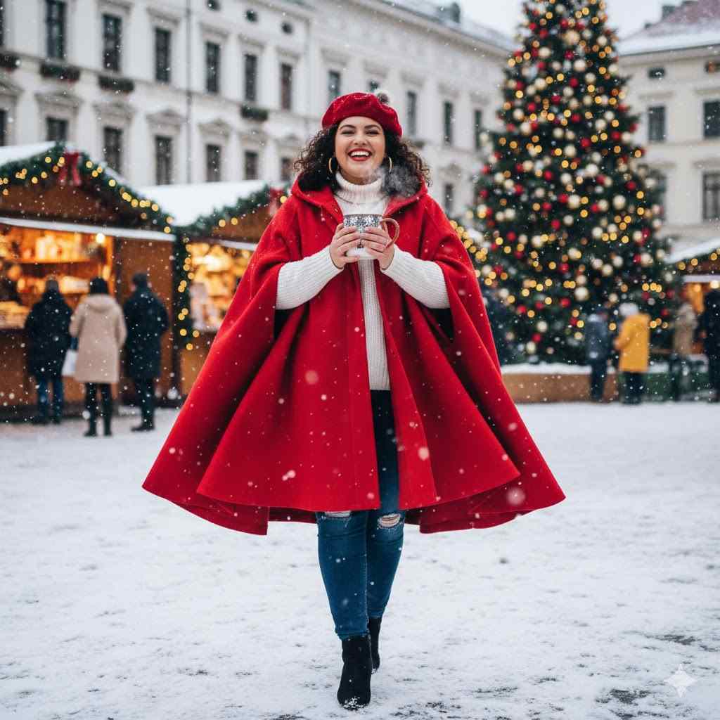 Cape coat in red atop jeans. Dramatic plus size Christmas outfit ideas.
